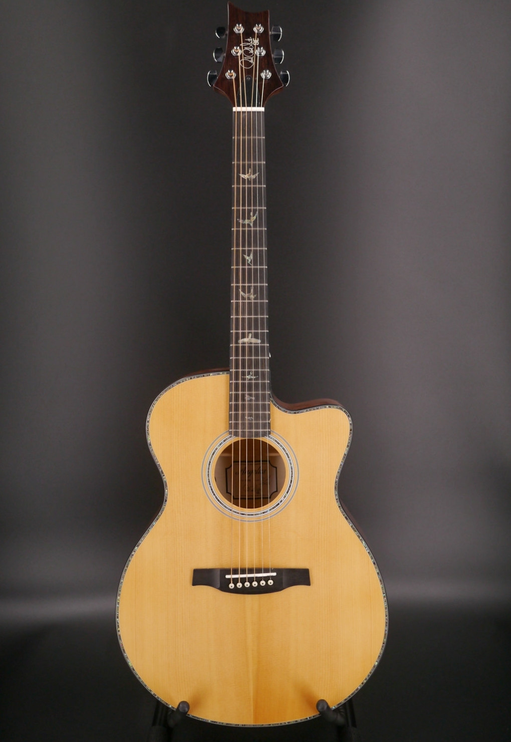 Additional high-quality features include a solid spruce top, ebony fretboard and bridge, bone nut and saddle, as well as PRS trademark bird inlays and headstock design. Ships with a high-quality hardshell case.