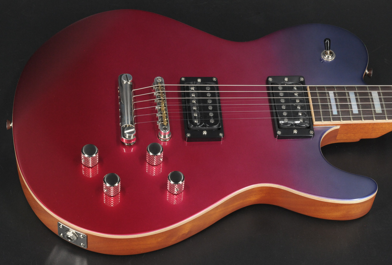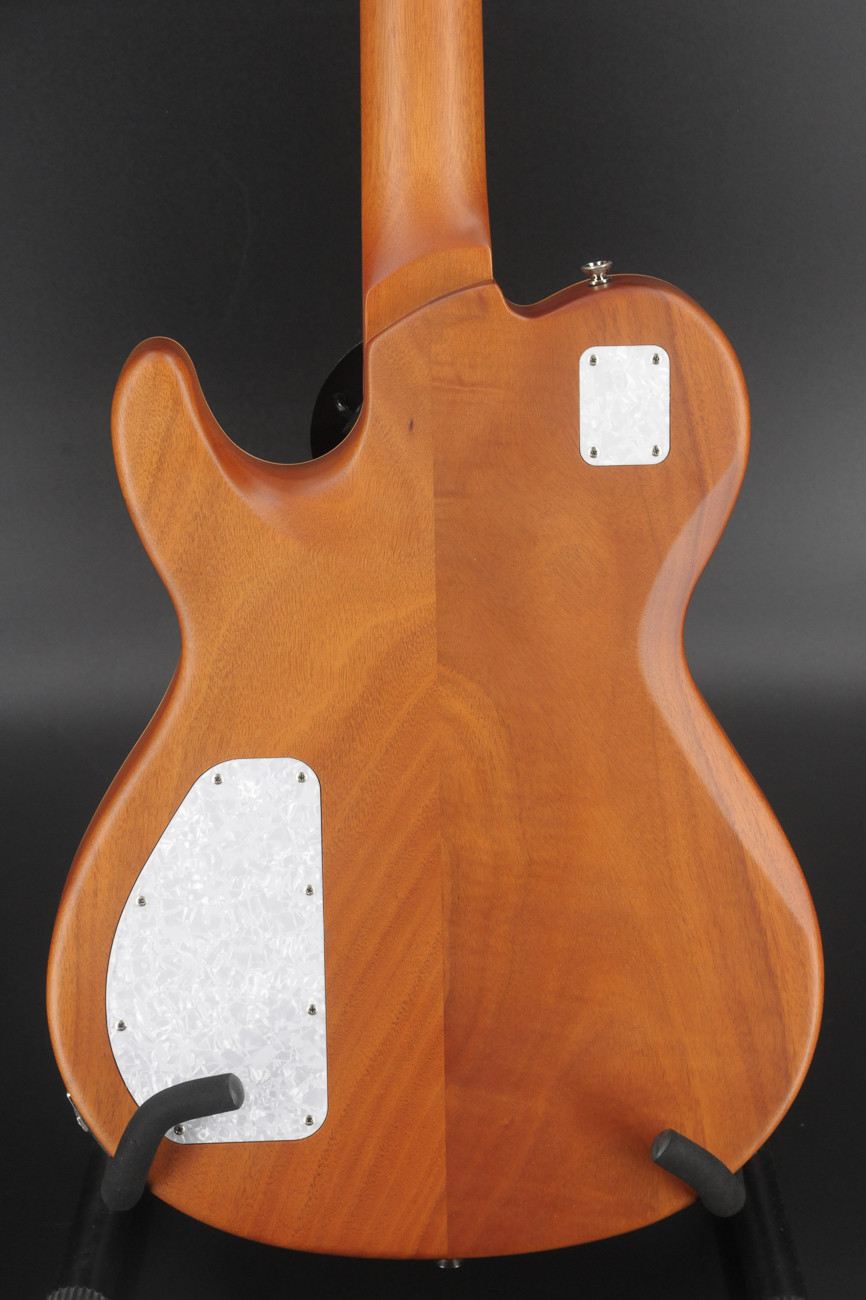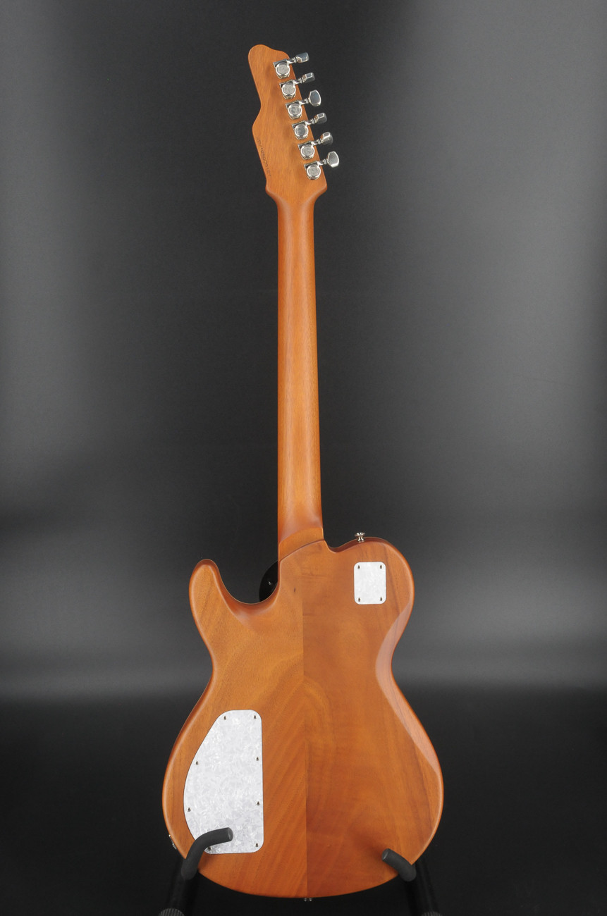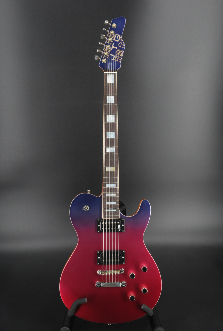 - Jim Burst Metallic- 2-piece Okoume body with 2-piece hard maple top- Scrapped binding- Okoume neck- Indian Rosewood fretboard w/ Tyler rolled edges- Maple binding- 9.5" radius- STD 59 neck (1st fret .850 12th fret .980)- 42mm Bone Nut- White Mother of Pearl inly- Luminlay side dots- Jescar 51100 frets (.100″ X .051)- Rear Rout- JTG Retro neck pickup- JTG Super bridge pickup- Dome Knobs- Tune-O-Matic bridge- JTG Locking Tuners- Strings D’Addario 10-46- 3-way toggle- 2 CTS volume and 2 tone 500K pots- Hardshell case
