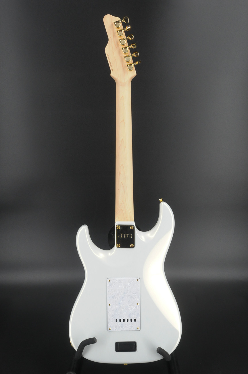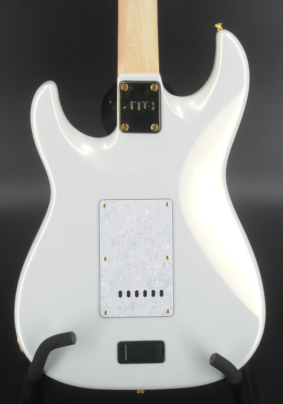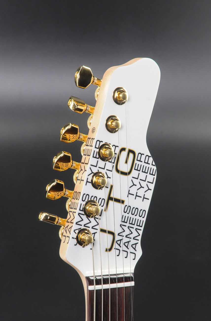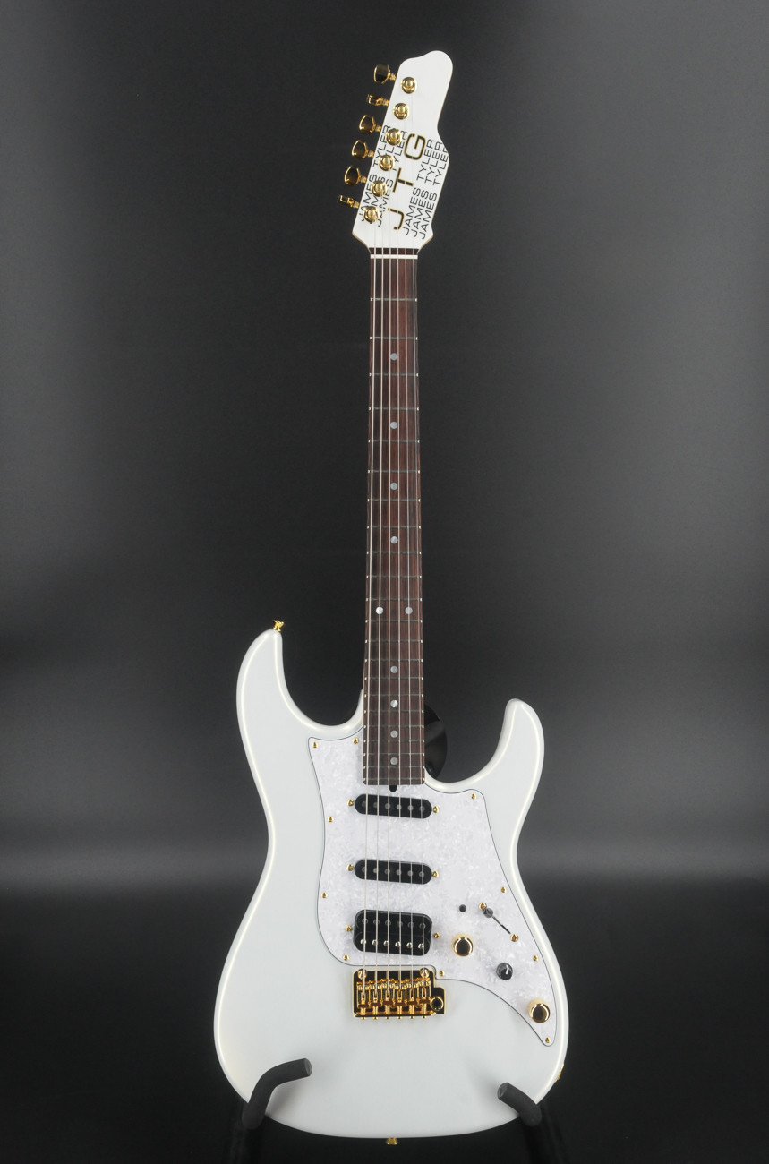 - White Pearl Metallic- 2-piece Alder body- Canadian Maple neck- Indian Rosewood fretboard w/ Tyler rolled edges- 10"-14" Radius- STD Thin C- 42mm Bone Nut- White Mother of Pearl inlay- Luminlay side dots- Jescar FW51100 frets- JTG 5500 SN neck pickup- JTG 5500 SM middle pickup- JTG Super H bridge pickup- Dome Knobs- 2 Post custom JTG bridge- Custom JTG Locking Tuners- Strings D’Addario 10-46- 5-way CTS 500k Vol 250k Tone- JTG custom midboost with bypass- Hardshell case