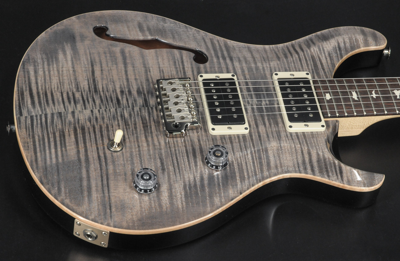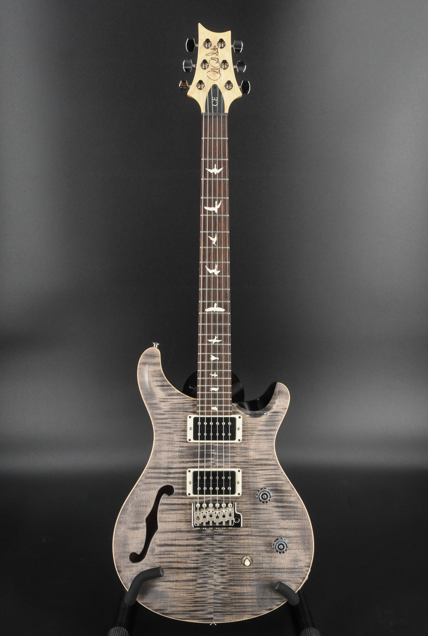 This model features a semi-hollow mahogany body with a single f-hole and a beautifully carved flamed maple top. The bolt-on maple neck has a Pattern Thin carve, with a rosewood fingerboard, 24 frets, a 25” scale length, and PRS’s signature bird inlays. It’s loaded with 85/15 humbuckers and a push/pull coil tap for a wide range of tones, along with a 3-way toggle, PRS’s patented molded tremolo bridge, and low-mass locking tuners.