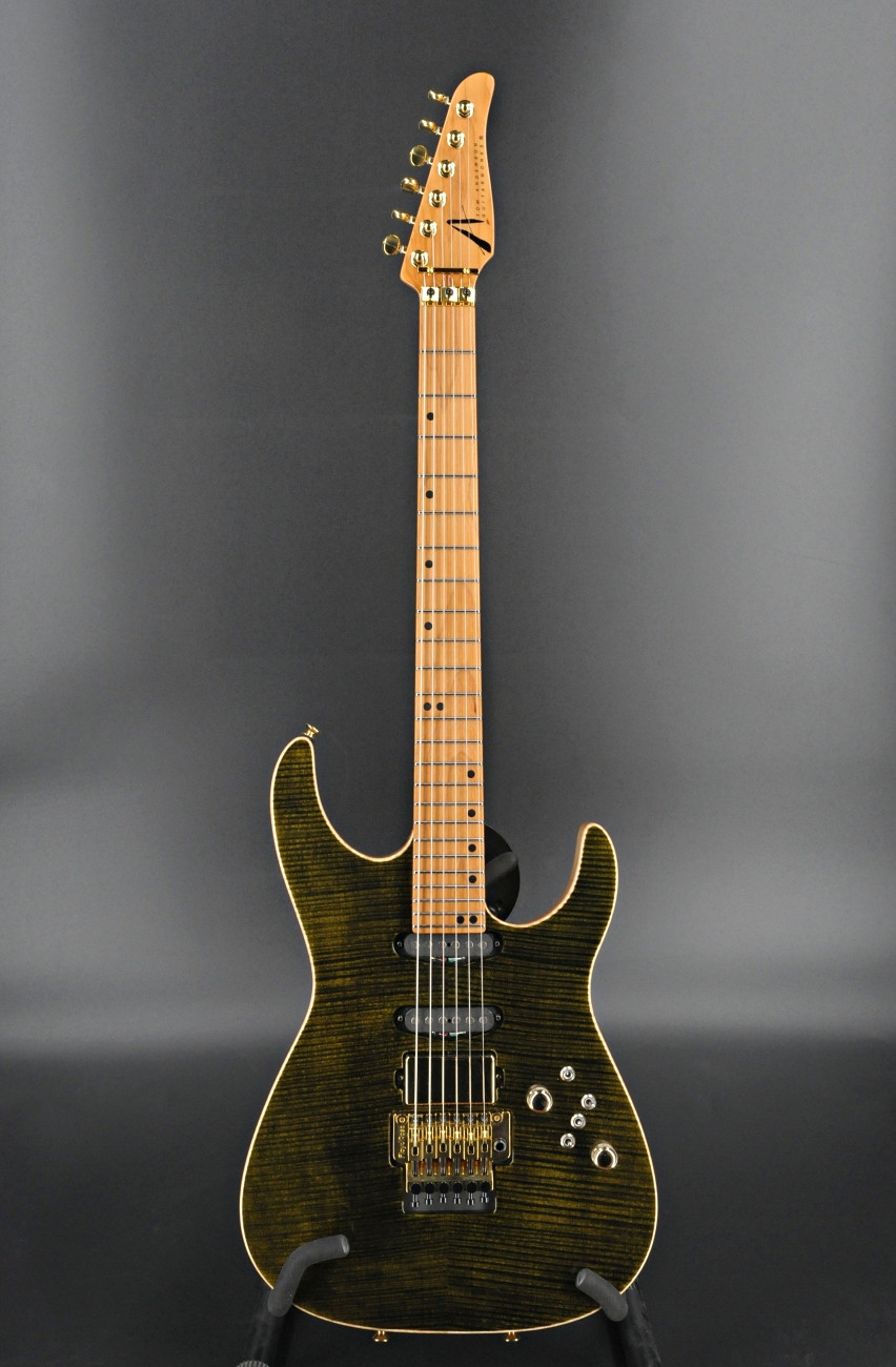 Tom Anderson Angel - Transparent Dark Olive w/ Binding - Flame Maple on Limba #1525 Item #1525