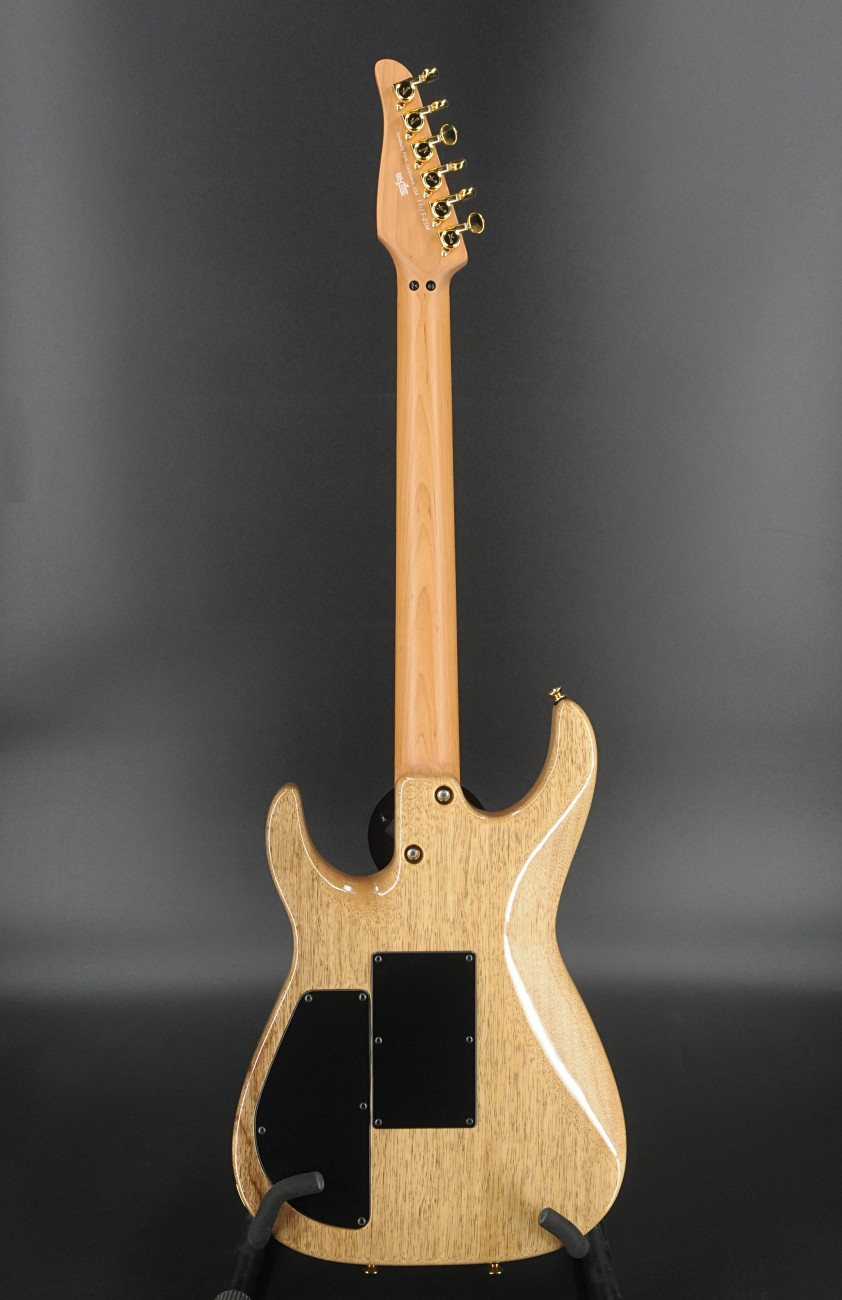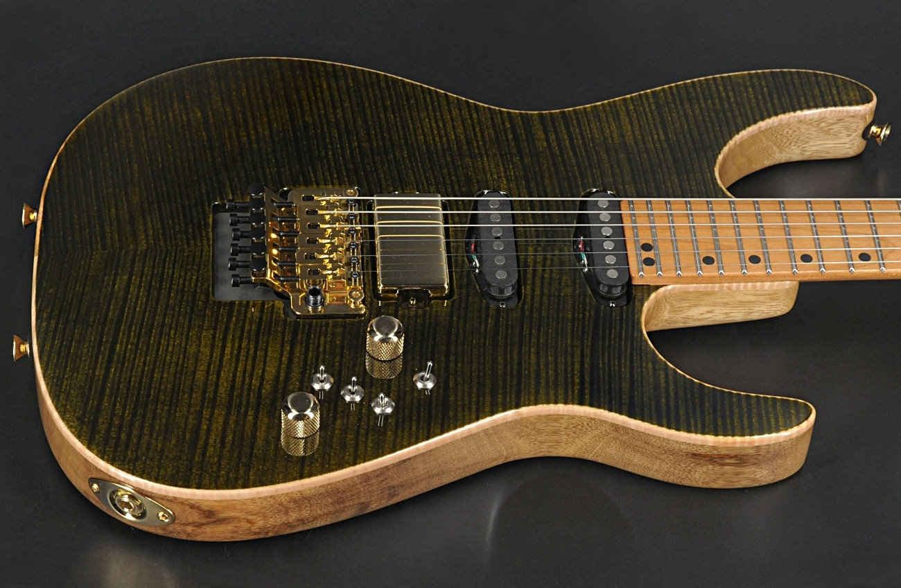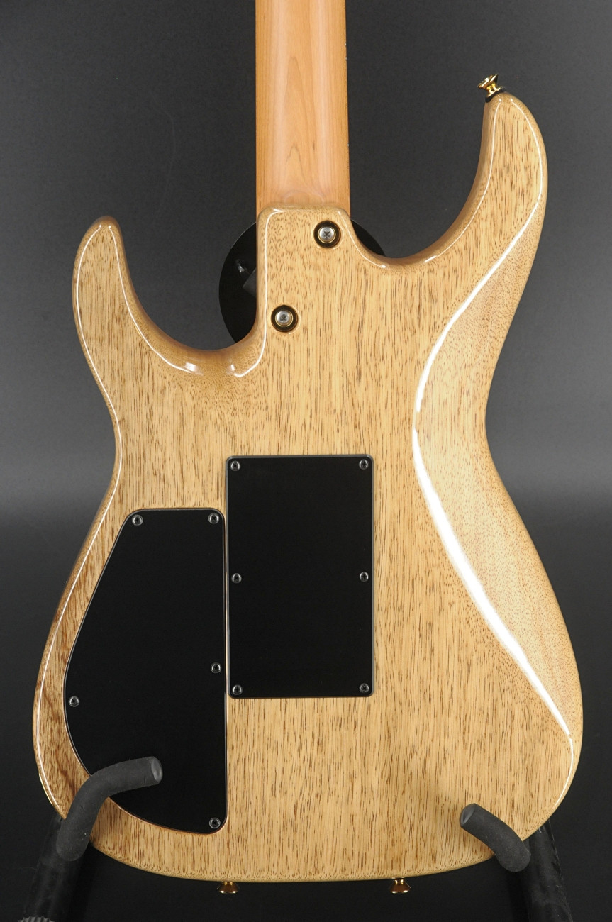 It has a super comfortable Even-Taper neck is made from caramel maple, with a matching caramel maple fingerboard. The neck has a satin natural finish that feels smooth and fast. The compound radius (12"–14") and jumbo stainless steel frets make bending and chording equally easy. The locking Floyd-Rose bridge is dive-bomb ready.