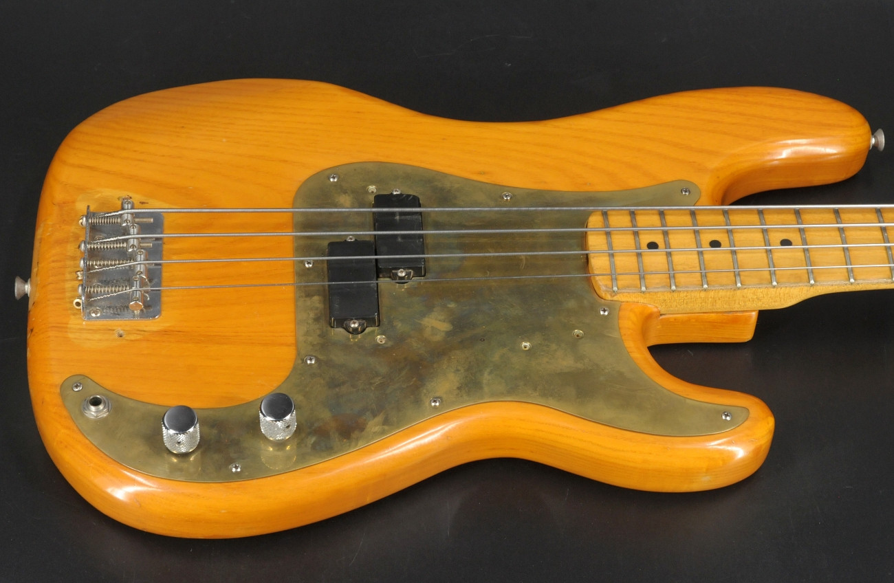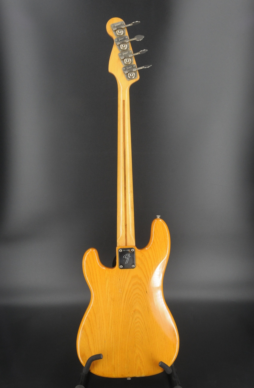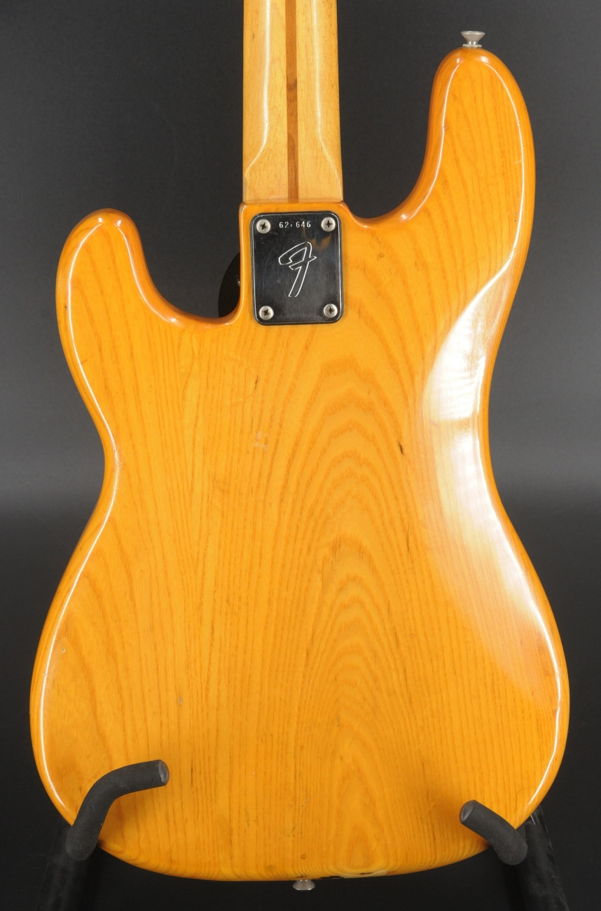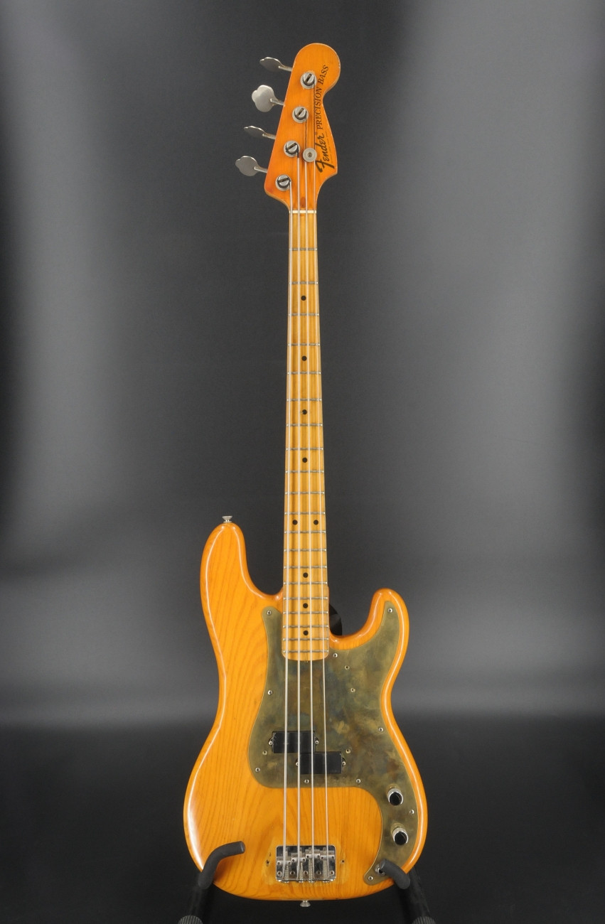 Here is a 1975 Fender Precision Bass with a natural finish, ash body, and maple neck and fingerboard. Serial number 626646.The bass plays and sounds great. Currently set up with flatwound strings it has that solid, authoritative Precision tone you’d expect from a mid '70s Fender. It is in good condition showing overall cosmetic wear that is entirely consistent with its age - nothing out of the ordinary for a 50-year-old instrument. The pickguard has been replaced with a solid brass guard, and the pickups were swapped out many years ago for EMG pickups. Based on the pots, the pickup change most likely dates to the 1980s. It is a great playing vintage Precision with some period correct mods. Includes the original hardshell case.