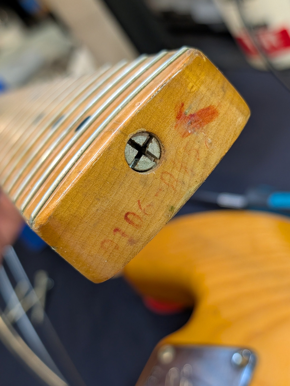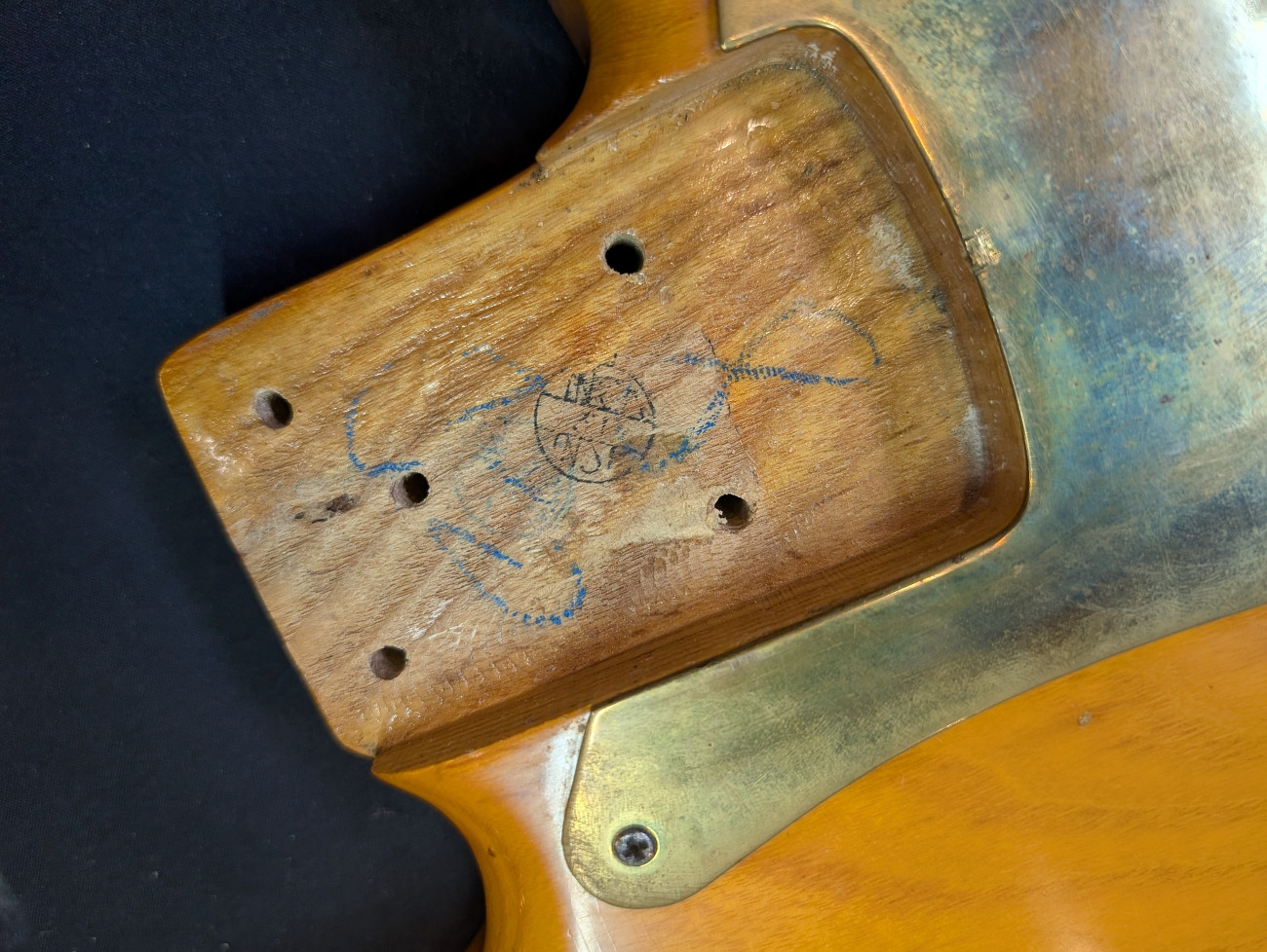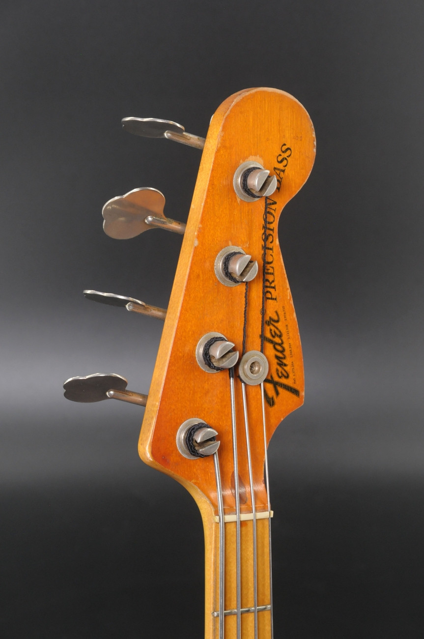 Here is a 1975 Fender Precision Bass with a natural finish, ash body, and maple neck and fingerboard. Serial number 626646.The bass plays and sounds great. Currently set up with flatwound strings it has that solid, authoritative Precision tone you’d expect from a mid '70s Fender. It is in good condition showing overall cosmetic wear that is entirely consistent with its age - nothing out of the ordinary for a 50-year-old instrument. The pickguard has been replaced with a solid brass guard, and the pickups were swapped out many years ago for EMG pickups. Based on the pots, the pickup change most likely dates to the 1980s. It is a great playing vintage Precision with some period correct mods. Includes the original hardshell case.