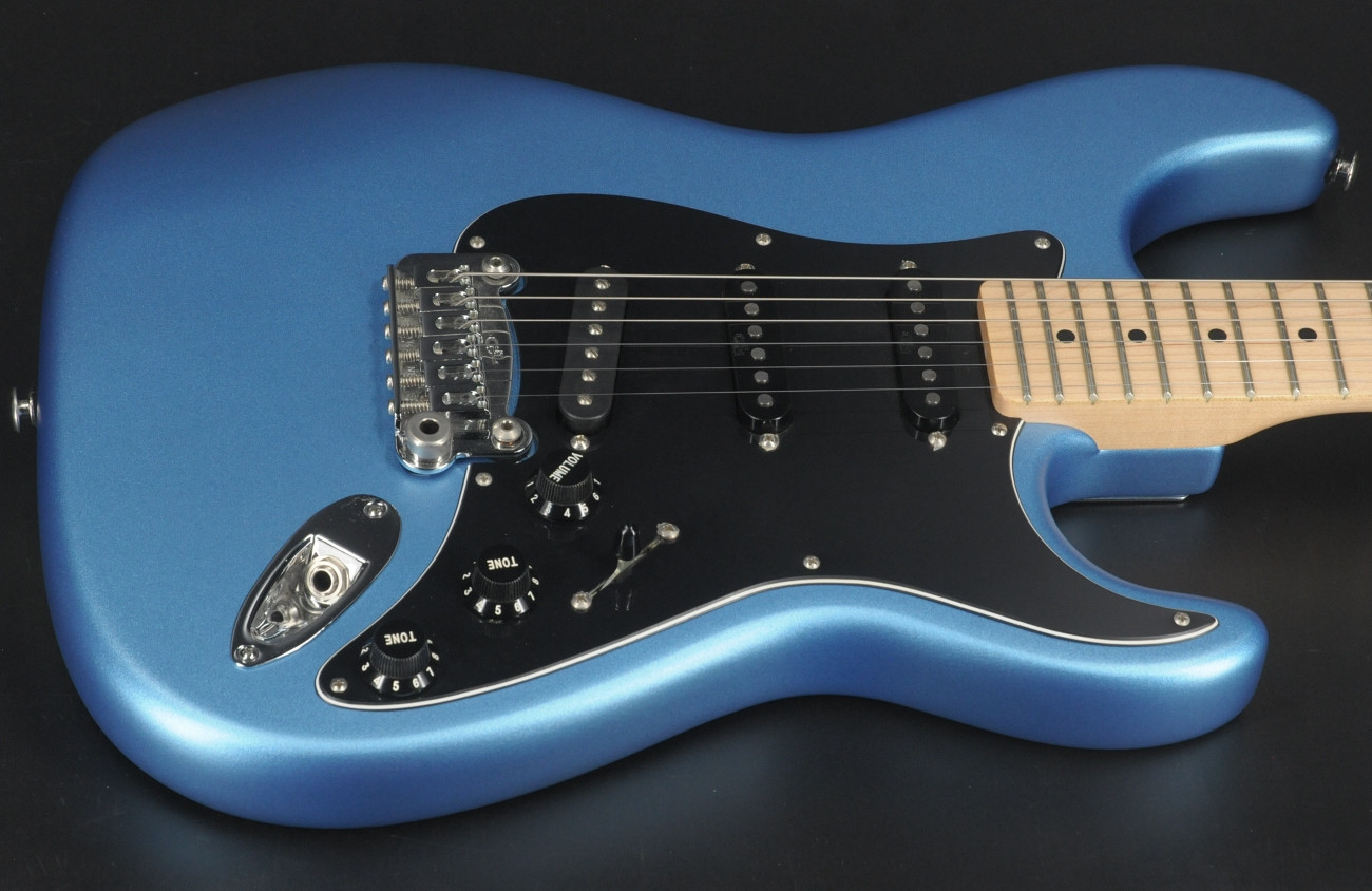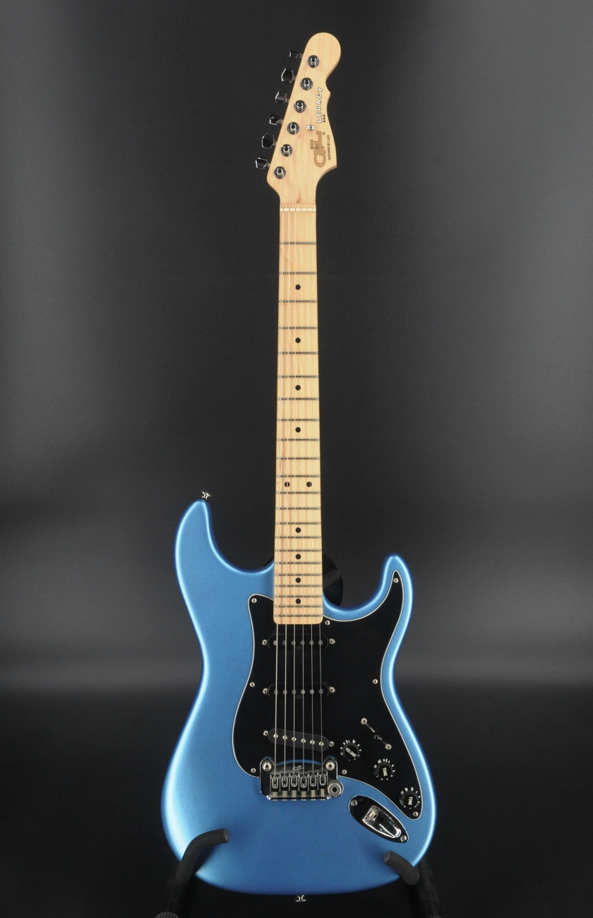 Here is a 2014 USA-made G&L Legacy in a very cool Lake Placid Blue Metallic Satin “Frost” finish.